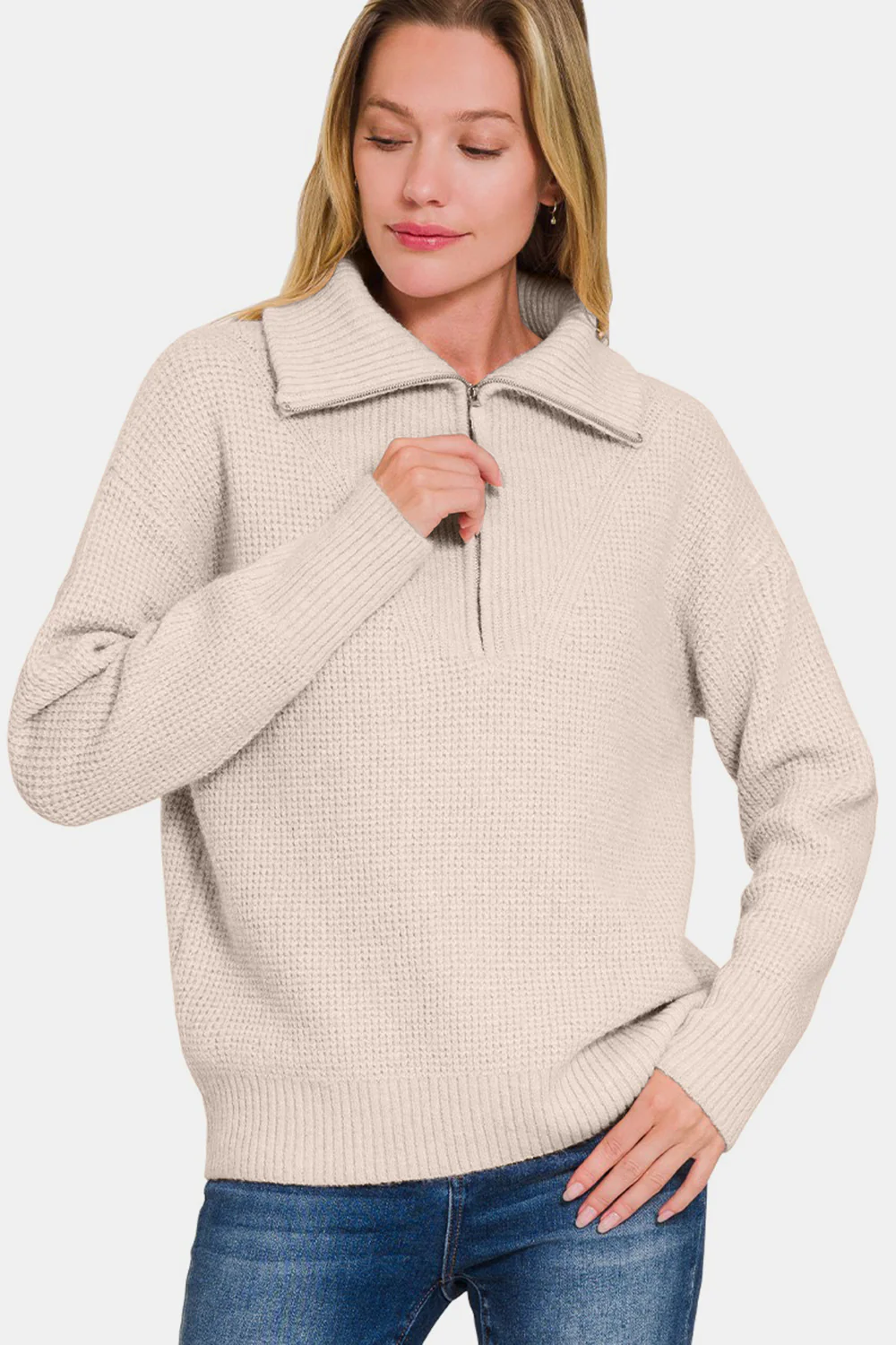 The Half Zip Long Sleeve Sweater is a stylish and practical wardrobe essential. With its half-zip design and long sleeves, this sweater offers a versatile and trendy look. Perfect for layering or wearing on its own, it provides both style and comfort for any occasion.